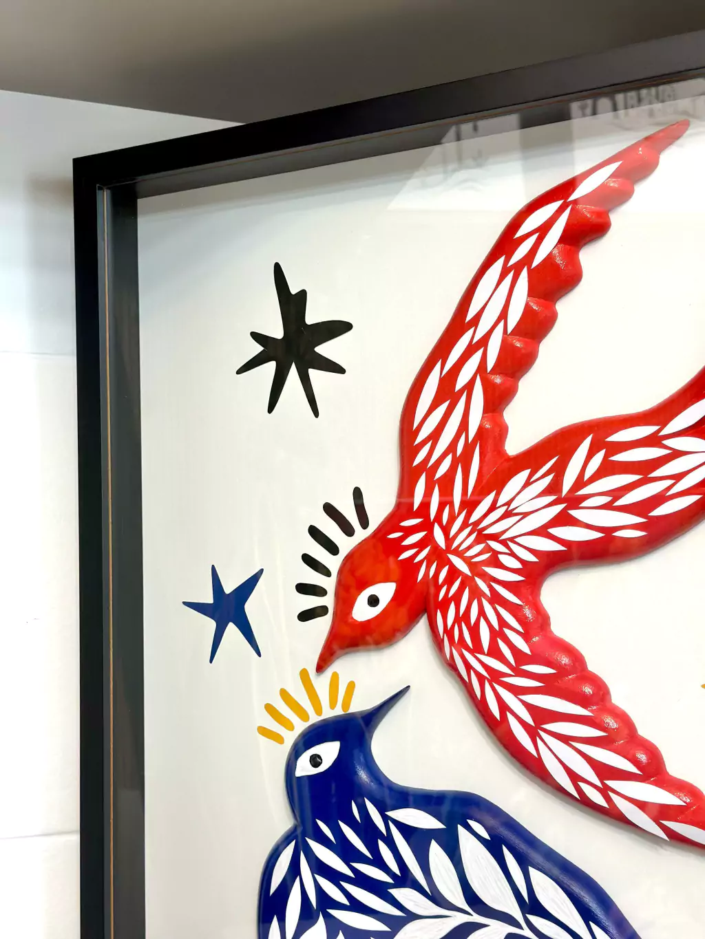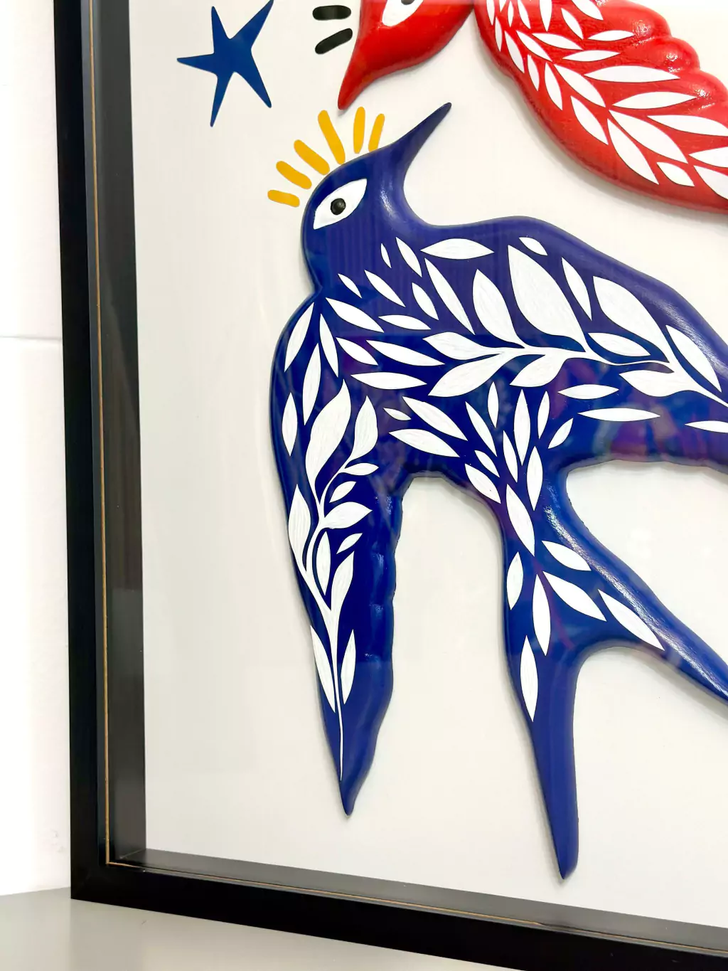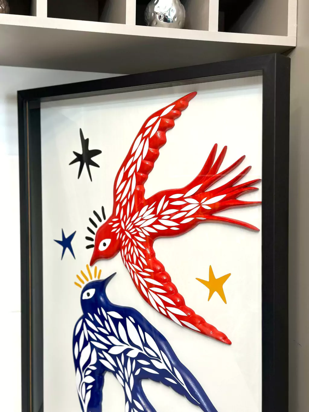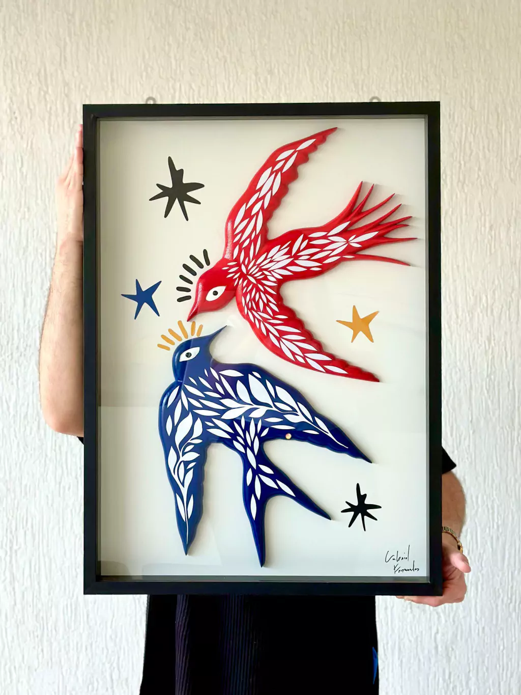 “Produzido a partir de esculturas em madeira nobre (cedro rosa), essa obra representa a liberdade e coragem de alçar voos!