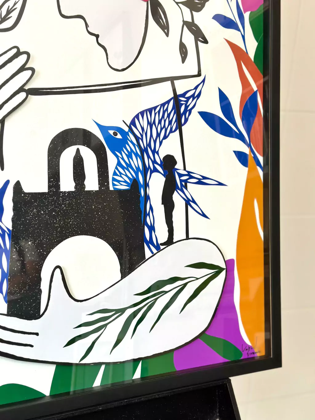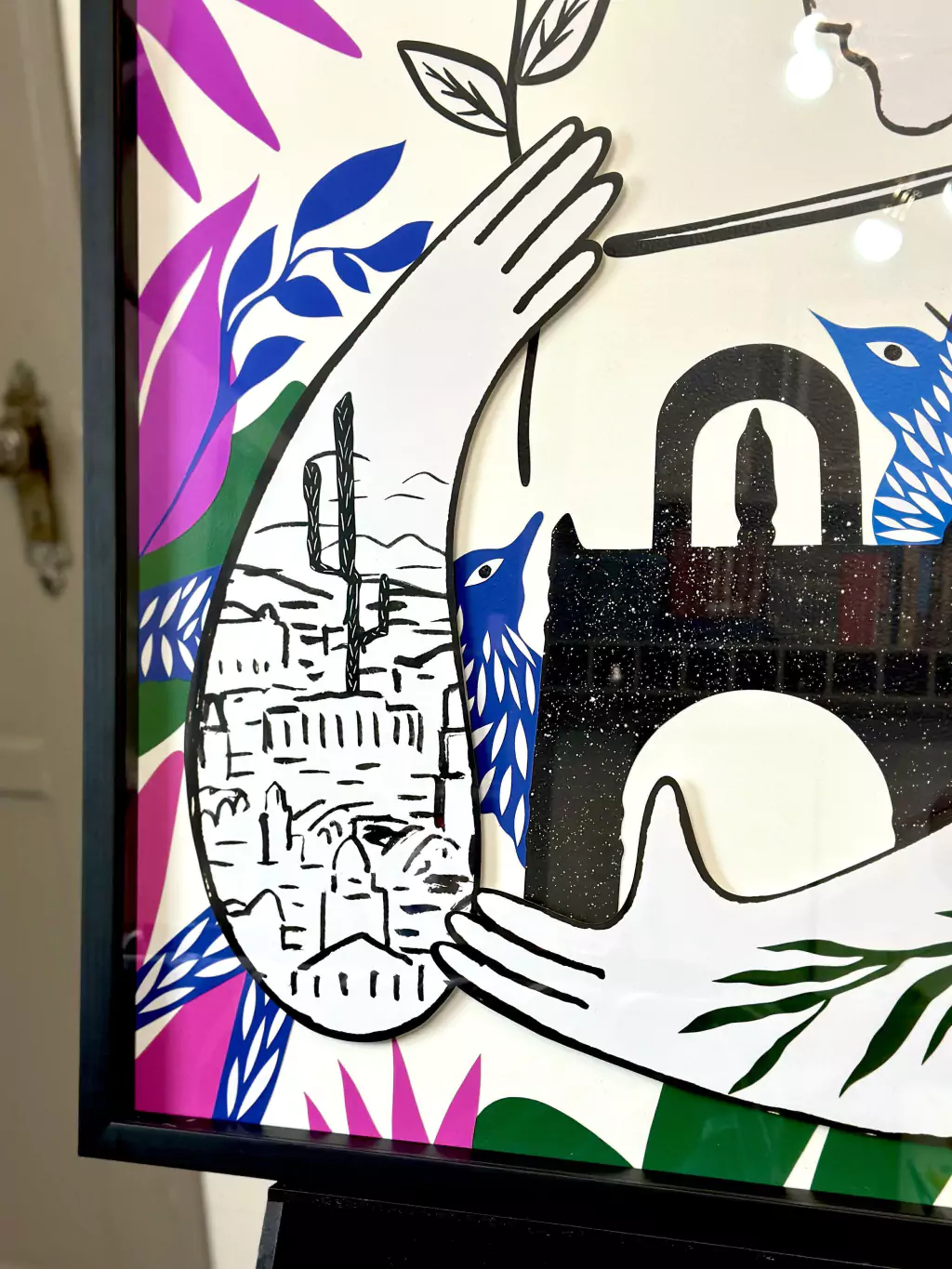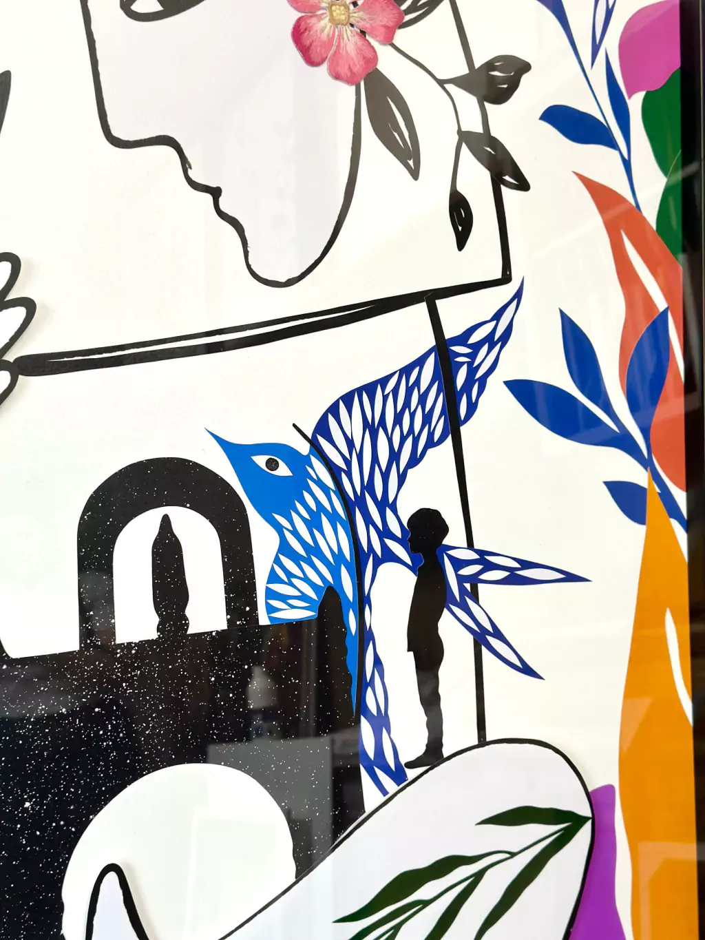- Colagem totalmente manual, com técnicas do estilo “collage”;