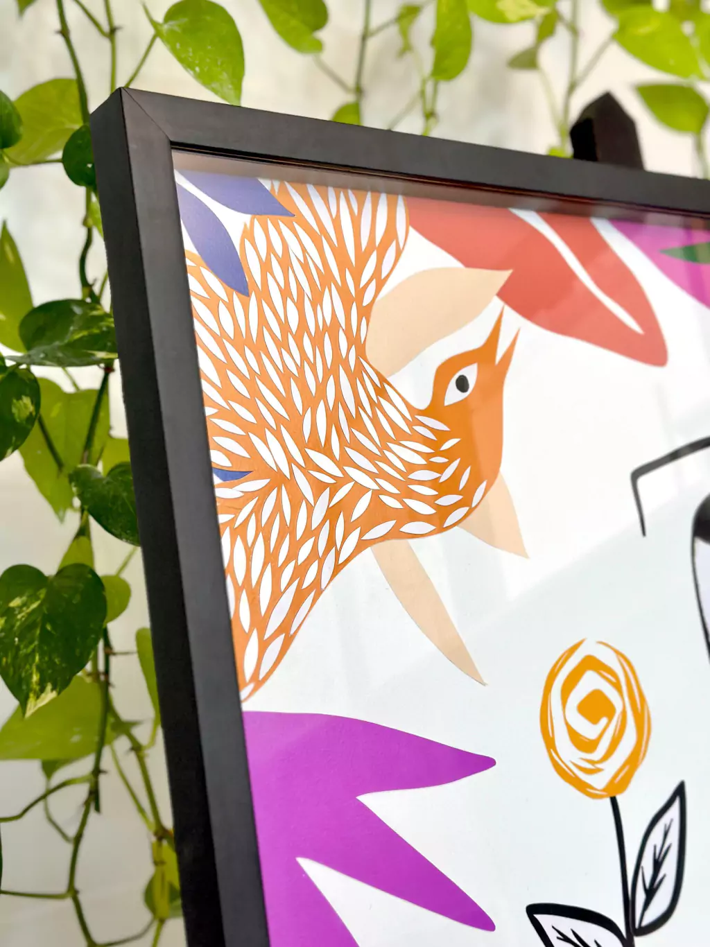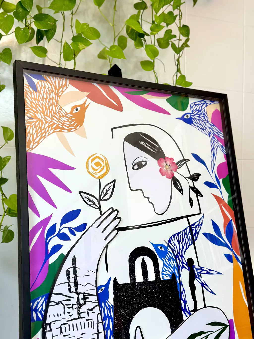 - Com tamanho de 72cm de largura e 92cm de comprimento a arte emoldurada;