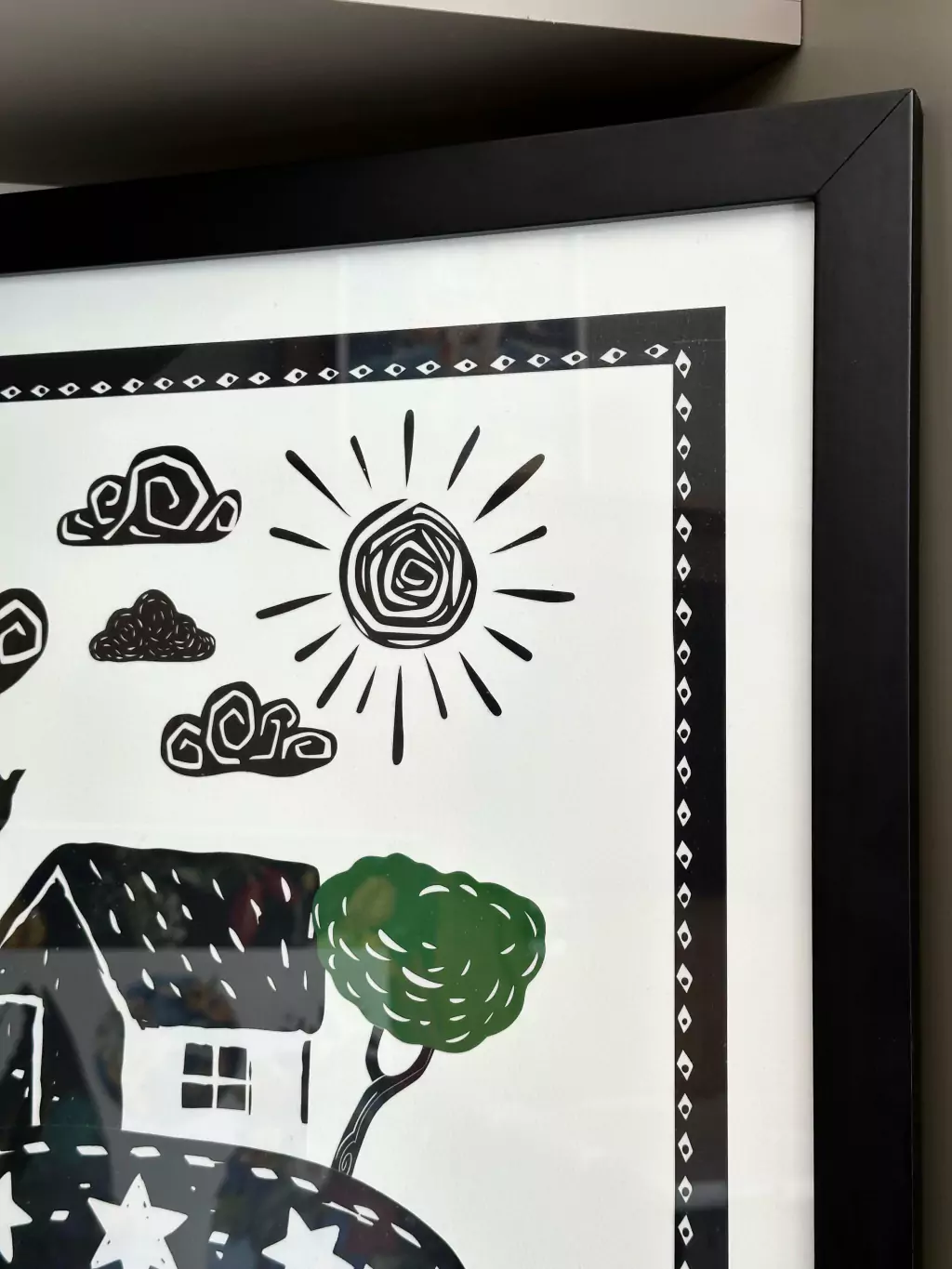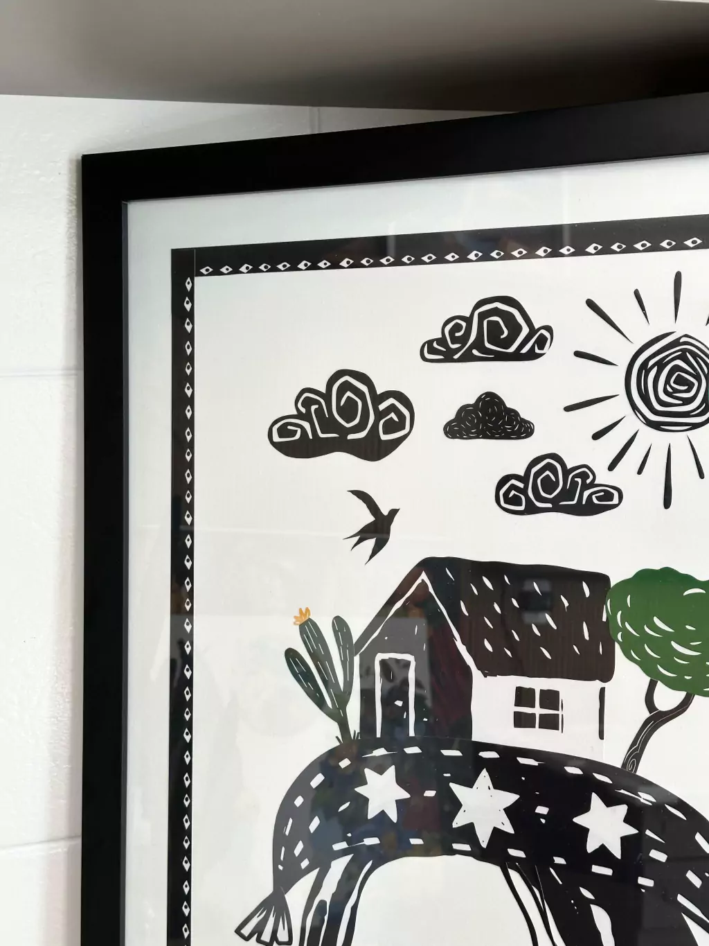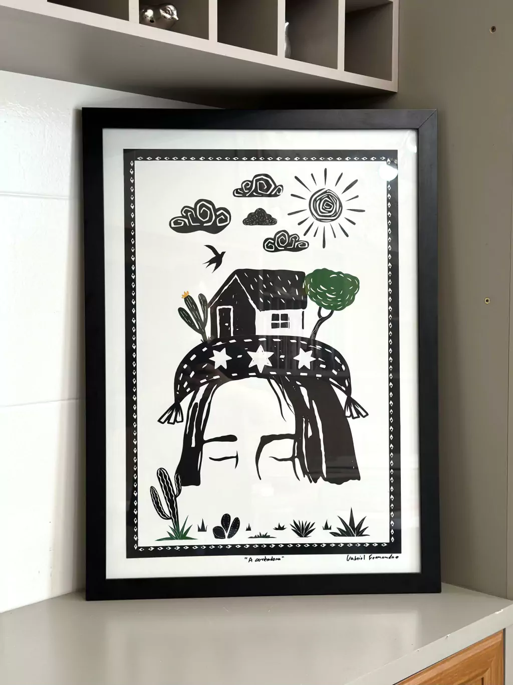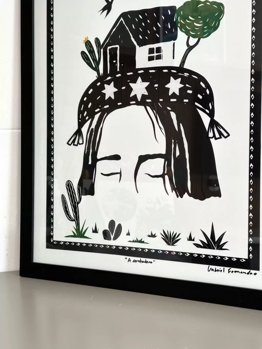 - Com tamanho de 54cm de largura e 74cm de comprimento a arte emoldurada;